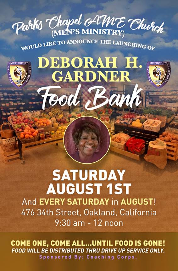 The Men’s Ministry, at Parks Chapel African Methodist Episcopal Church, located at 476 34th Street Oakland is sponsoring the Deborah H. Gardner Food Bank August 1st. from 9:30am=12 noon. Drive up contact free food delivery is available as well as walk up service.