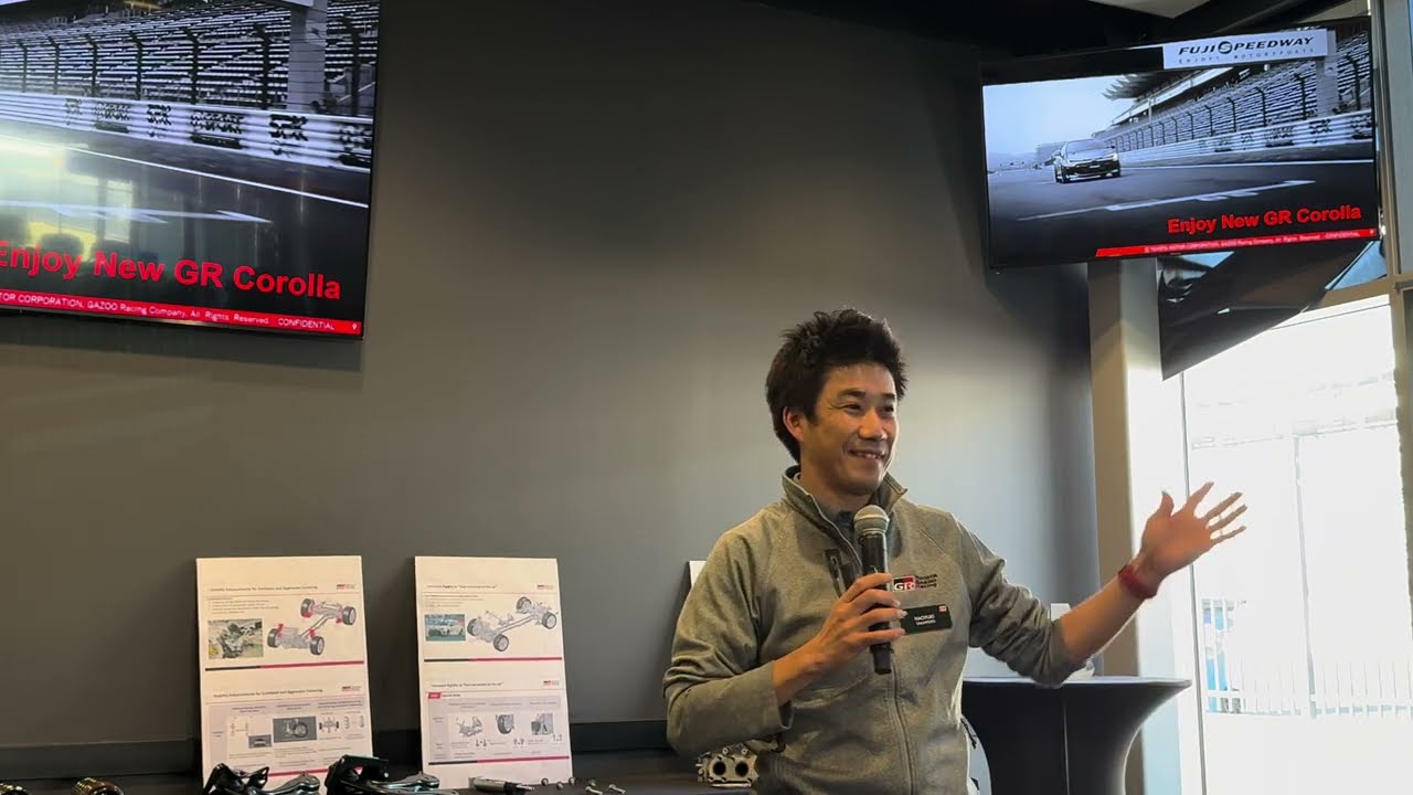 Chief engineer Naoyuki Sakamoto discusses the GR Corolla’s capabilities with attending journalists and how the GR fits in motorsports.
