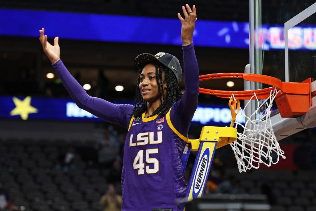DALLAS, TEXAS – APRIL 02: Alexis Morris #45 of the LSU Lady Tigers poses during the net cutting ceremony after defeating the Iowa Hawkeyes 102-85 during the 2023 NCAA Women’s Basketball Tournament championship game at American Airlines Center on April 02, 2023 in Dallas, Texas. (Photo by Tom Pennington/Getty Images)