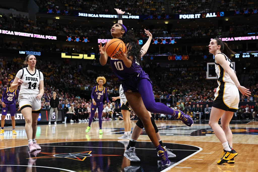 DALLAS, TEXAS – APRIL 02: Angel Reese #10 of the LSU Lady Tigers drives to the basket during the fourth quarter against the Iowa Hawkeyes during the 2023 NCAA Women’s Basketball Tournament championship game at American Airlines Center on April 02, 2023 in Dallas, Texas. (Photo by Tom Pennington/Getty Images)