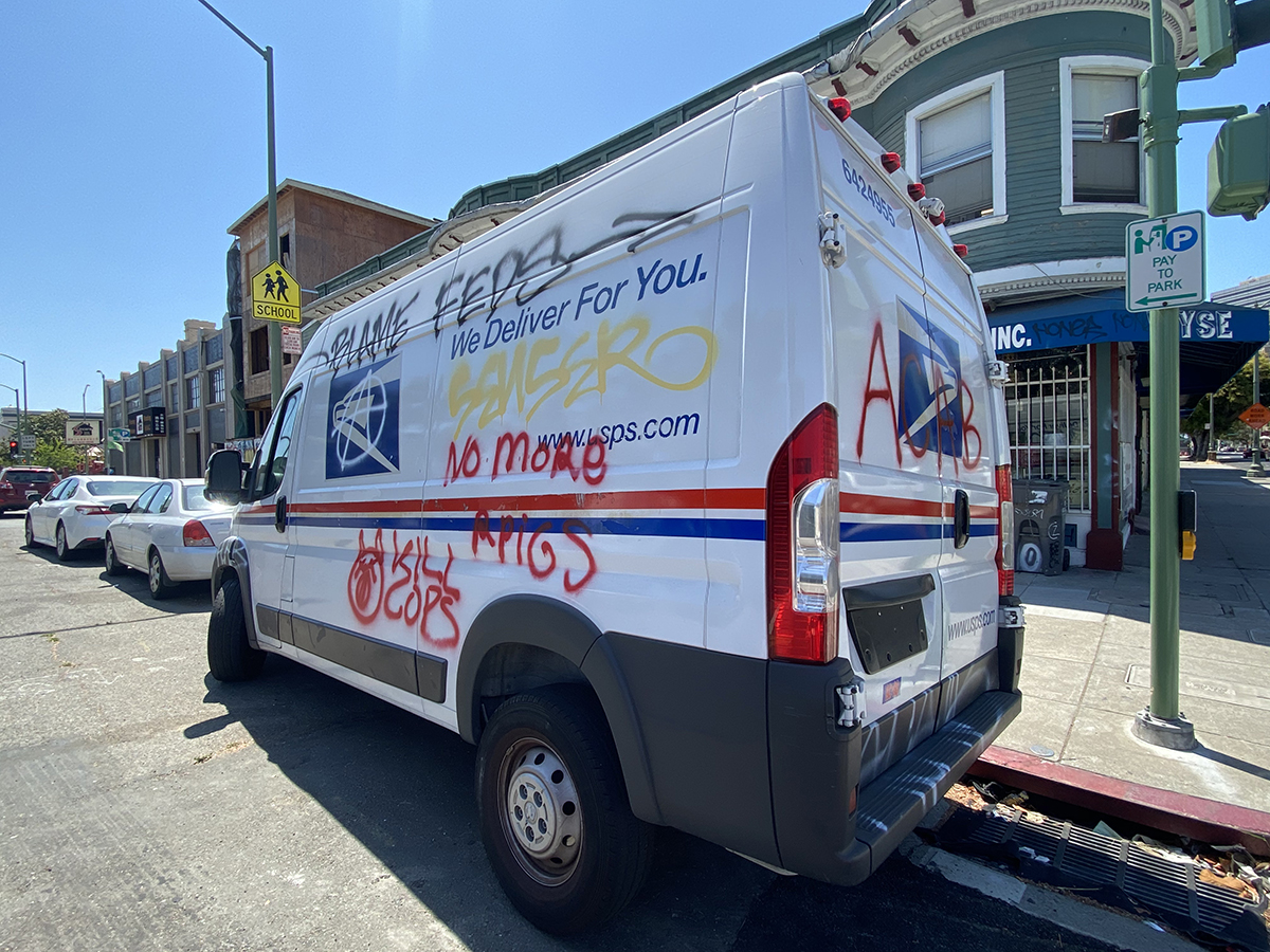 Mail truck spray painted with another view