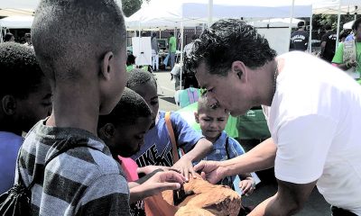 Mayoral candidate Ken Houston introduces “Chip” to children at the Aug. 11 Health & Job Fair. Chip, the Bay Bridge Chicken, honorary member of the Oakland...