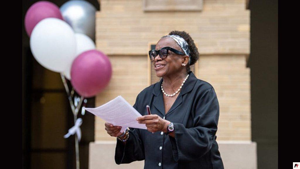 ABOVE: Kathleen McElroy is announced as director of Texas A&M’s Communications & Journalism Department in a ceremony outside the Academic Building. (Photo by Meredith Seaver/The Eagle)