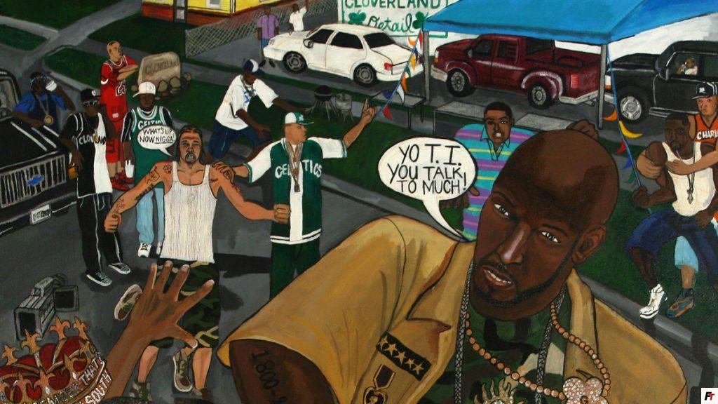 El Franco aptly refers to his style as Urban Mannerist Pop Art as the bizarre and grotesque come together in his paintings in ways that feel illogical, but perfectly balanced. His compressed and flattened figures form grand tableaux, fueling, as Outkast puts it, “the art of storytelling.” In his paintings, El Franco bobs and weaves his way from historical figures such as the boxer Jack Johnson, through other Black icons such as Michael Jackson, Jordan, Tupac, and JR Richards. But it is his masterful chronology of Houston Hip Hop lore, specifically his depictions of the late Houston Rapper DJ Screw and his Screwed Up Click (SUC) that Lee is most known for.