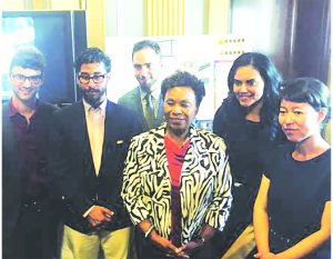Laney College carpentry presents the Pocket House at Capitol Hill. Right to left: Digital fabrication instructor Marisha Farnsworth, Laney student Kim Gordon, Congressperson Barbara Lee, Laney students Daniel Ticket, Miguel Vega, and Rick Rothbart.