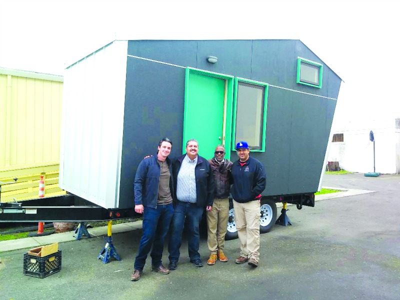 Truck driver Martin Kauffman (far left) and electrician Art Ramirez (far right), who both donated their services to deliver Laney College’s tiny home prototype to West Side Missionary Baptist Church, stand in front of the Pocket House Model M with Rev. Ken Chambers (middle right) and Councilmember Abel Guillén (middle left).